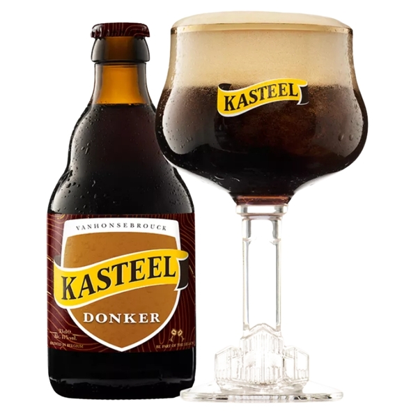 Bia Kasteel Donker Chai 330ml là dòng bia Belgian Quadrupel cao cấp, sản phẩm chủ lực của Brouwerij Van Honsebrouck tại Ingelmunster, Bỉ, thuộc thương hiệu Kasteel nổi tiếng với biểu tượng lâu đài. Ra mắt từ năm 1989, Kasteel Donker là bia đầu tiên của dòng Kasteel, mang tên lâu đài Ingelmunster tráng lệ của gia đình Van Honsebrouck, được in trên nhãn chai, nắp chai, và ly bia. Bia được lên men đỉnh theo phương pháp truyền thống Bỉ, sử dụng hoa bia nhập từ Anh, trải qua quá trình lọc ly tâm để giữ hương vị tinh khiết. Hương thơm đậm đà của sô-cô-la, caramel, cam thảo, chuối, và nho khô hòa quyện với chút thảo mộc và mạch nha rang. Vị bia mượt mà, ngọt ngào từ đường phèn và mạch nha, cân bằng với đắng giòn từ hoa bia, mang lại hậu vị khô, ấm áp, gợi nhớ đến rượu vang.