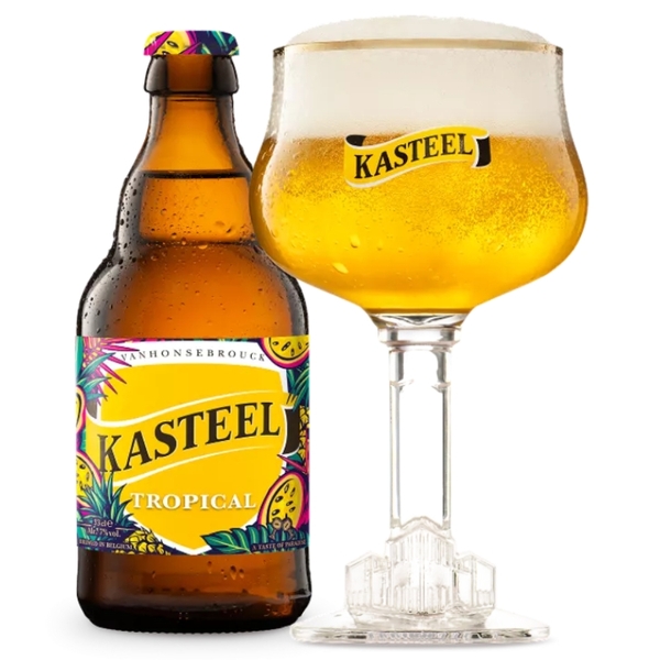 Bia Kasteel Tropical Chai 330ml là một dòng bia trái cây (Fruit Beer) cao cấp, được sản xuất bởi Brouwerij Van Honsebrouck tại Ingelmunster, Bỉ, thuộc thương hiệu Kasteel nổi tiếng với biểu tượng lâu đài. Ra mắt như một sản phẩm mới trong dòng Kasteel, bia này mang đến trải nghiệm mùa hè với màu vàng tươi sáng và lớp bọt trắng dày, mịn, bền bỉ. Kasteel Tropical được lên men đỉnh (top-fermented) và sử dụng các nguyên liệu tự nhiên như mạch nha lúa mạch, lúa mì, hoa bia, và cô đặc trái cây (0.3% dứa, 0.5% chanh dây, 1% đào, 0.3% xoài). Hương thơm đậm chất nhiệt đới với nốt chanh dây nổi bật, hòa quyện cùng xoài, đào, và chút dứa ngọt nhẹ. Vị bia cân bằng giữa ngọt dịu từ trái cây, đắng thanh từ hoa bia, và hậu vị khô, hơi đắng, mang lại cảm giác sảng khoái, lý tưởng cho những ngày nóng.