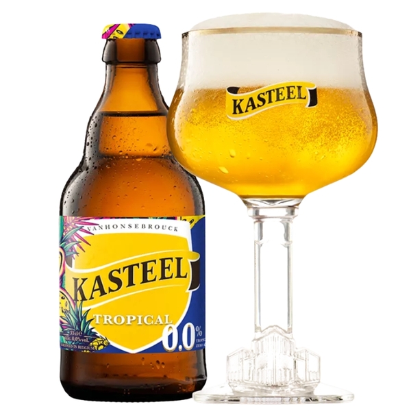 Bia Kasteel Tropical 0.0% Chai 330ml là một dòng bia không cồn (0.0% ABV) cao cấp, được sản xuất bởi Brouwerij Van Honsebrouck tại Ingelmunster, Bỉ, thuộc thương hiệu Kasteel nổi tiếng với biểu tượng lâu đài. Là phiên bản không cồn của Kasteel Tropical, bia này giữ trọn hương vị trái cây nhiệt đới đặc trưng, mang đến trải nghiệm mùa hè tươi mát mà không lo say. Bia sử dụng các nguyên liệu tự nhiên như nước, mạch nha lúa mạch, lúa mì, cô đặc trái cây (chanh dây, dứa, xoài, đào), và chất làm ngọt stevia, kết hợp với công nghệ tách cồn tiên tiến để giữ nguyên hương vị bia truyền thống. Hương thơm nổi bật với nốt chanh dây, xoài, dứa, và chút đào ngọt nhẹ, tạo cảm giác sảng khoái. Vị bia cân bằng giữa ngọt dịu từ trái cây, chút đắng nhẹ từ hoa bia, và hậu vị khô, hơi chua, mang đến trải nghiệm giống soda trái cây cao cấp.
